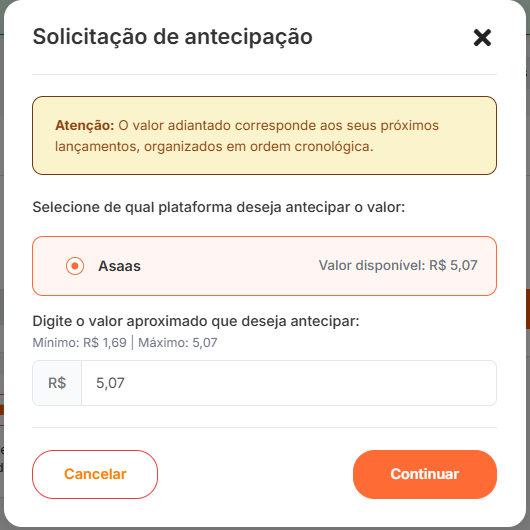 No seu painel, no menu “financeiro”, clique no botão “Antecipar Saldo”.