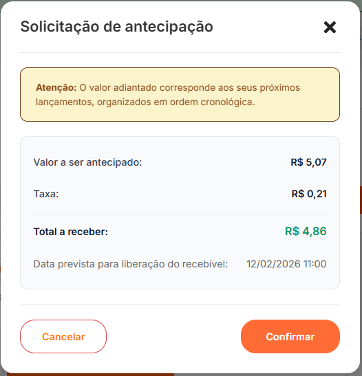 Caso você cancele ou abandone a etapa de confirmação da antecipação, o valor pode demorar até 10 minutos para voltar a ficar disponível para antecipação. Não se preocupe, se você não confirmar a antecipação o valor voltará a ser mostrado como “a receber”.