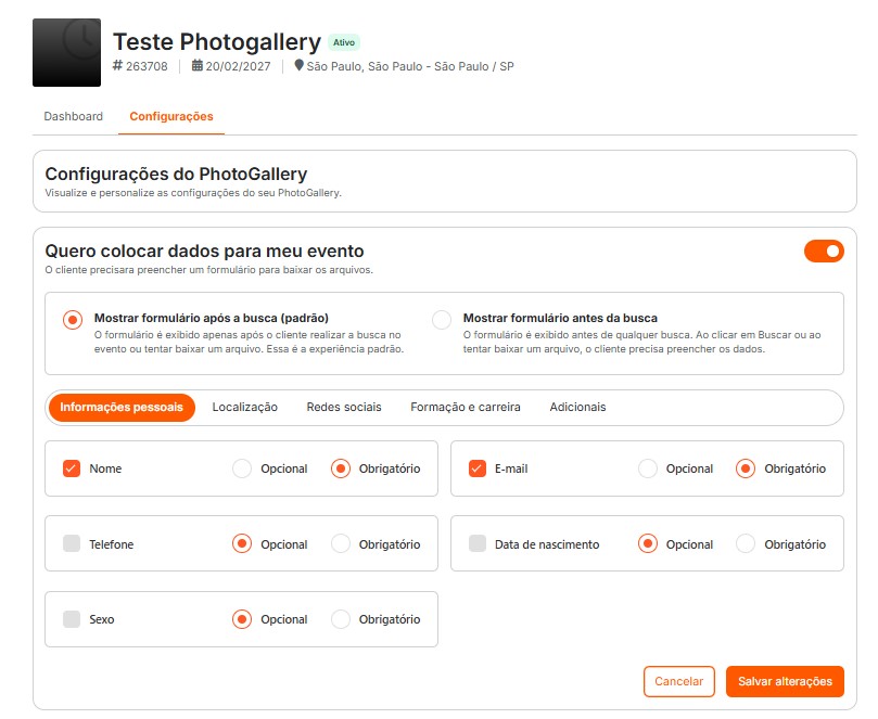 Mostrar formulário após a busca (Padrão): O cliente navega e busca suas fotos primeiro. O formulário só aparece quando ele tenta baixar um arquivo. É ótimo para não "barrar" a curiosidade inicial.