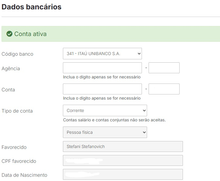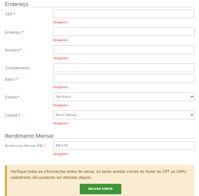 - Preencha os dados de sua conta bancária que deseja receber os valores, seu endereço, rendimento mensal e salve.